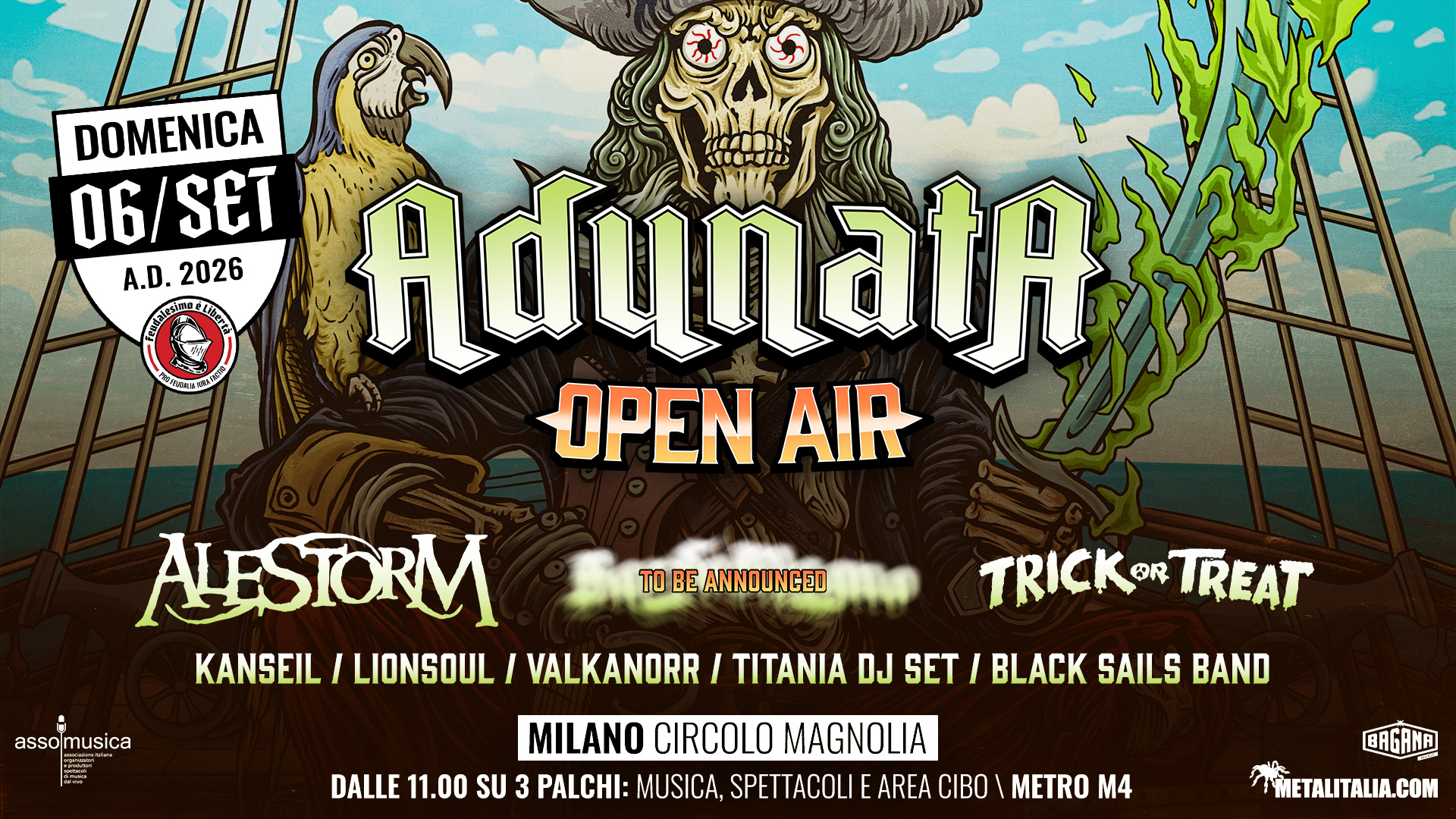 In occasione dei dieci anni dalla prima Adunata FeL, Bagana Music Agency e Feudalesimo e Libertà annunciano la nascita di ADUNATA OPEN AIR, il nuovo festival estivo che si terrà Domenica 6 Settembre 2026 al Circolo MAGNOLIA di Milano.